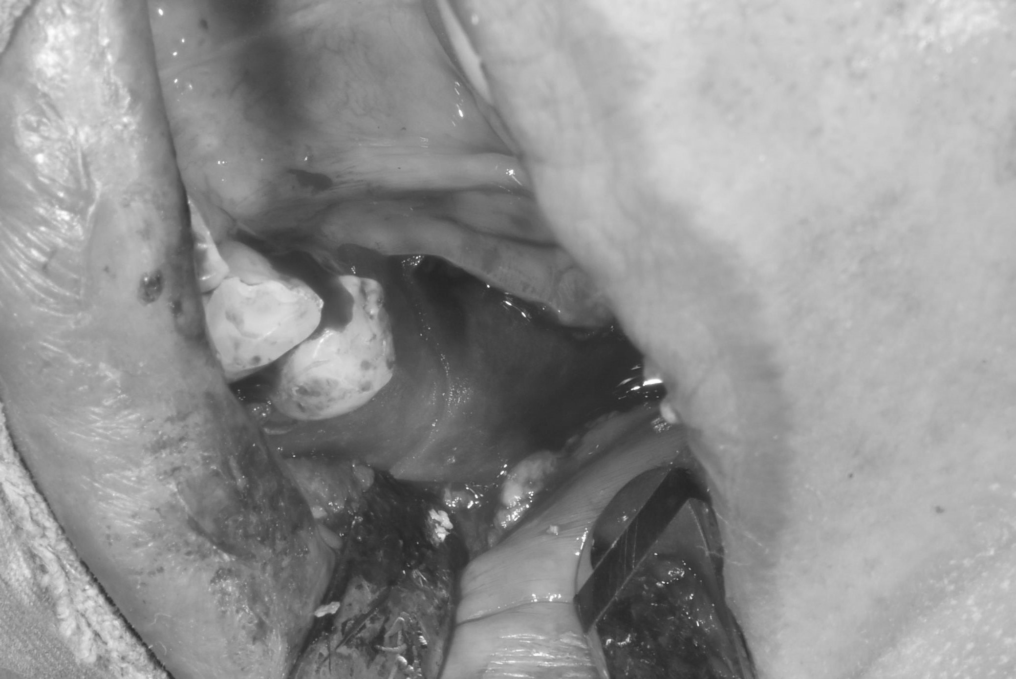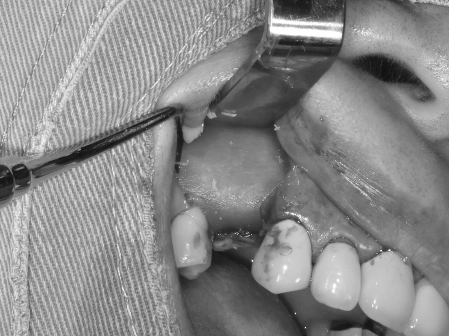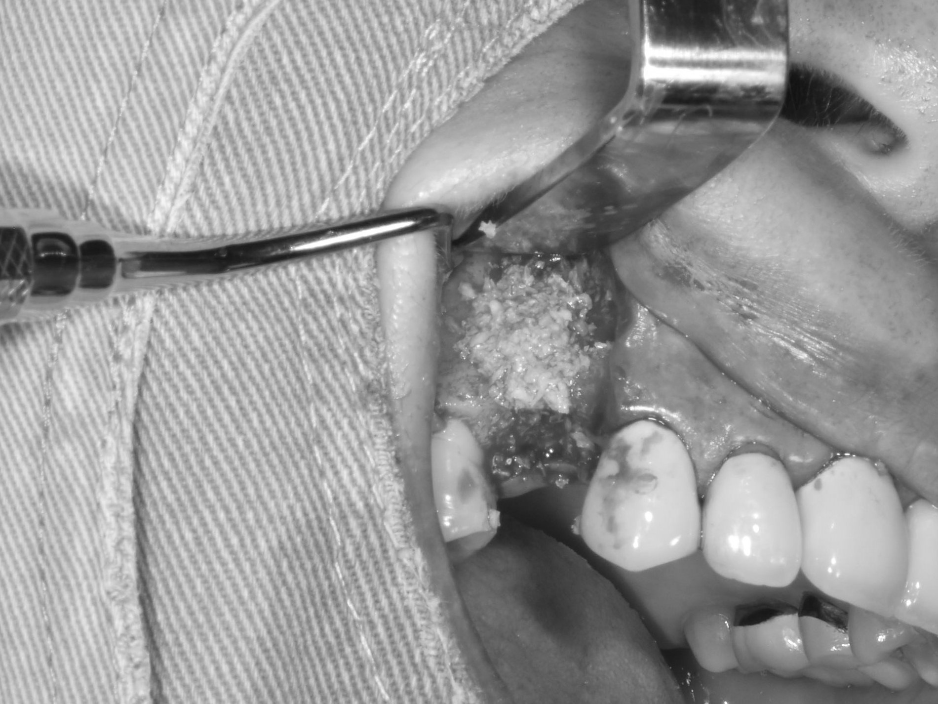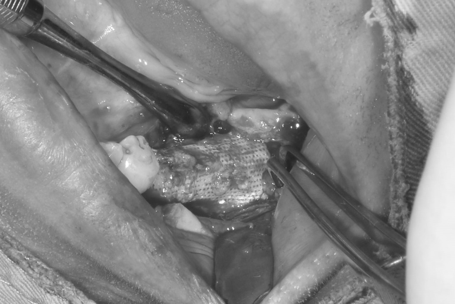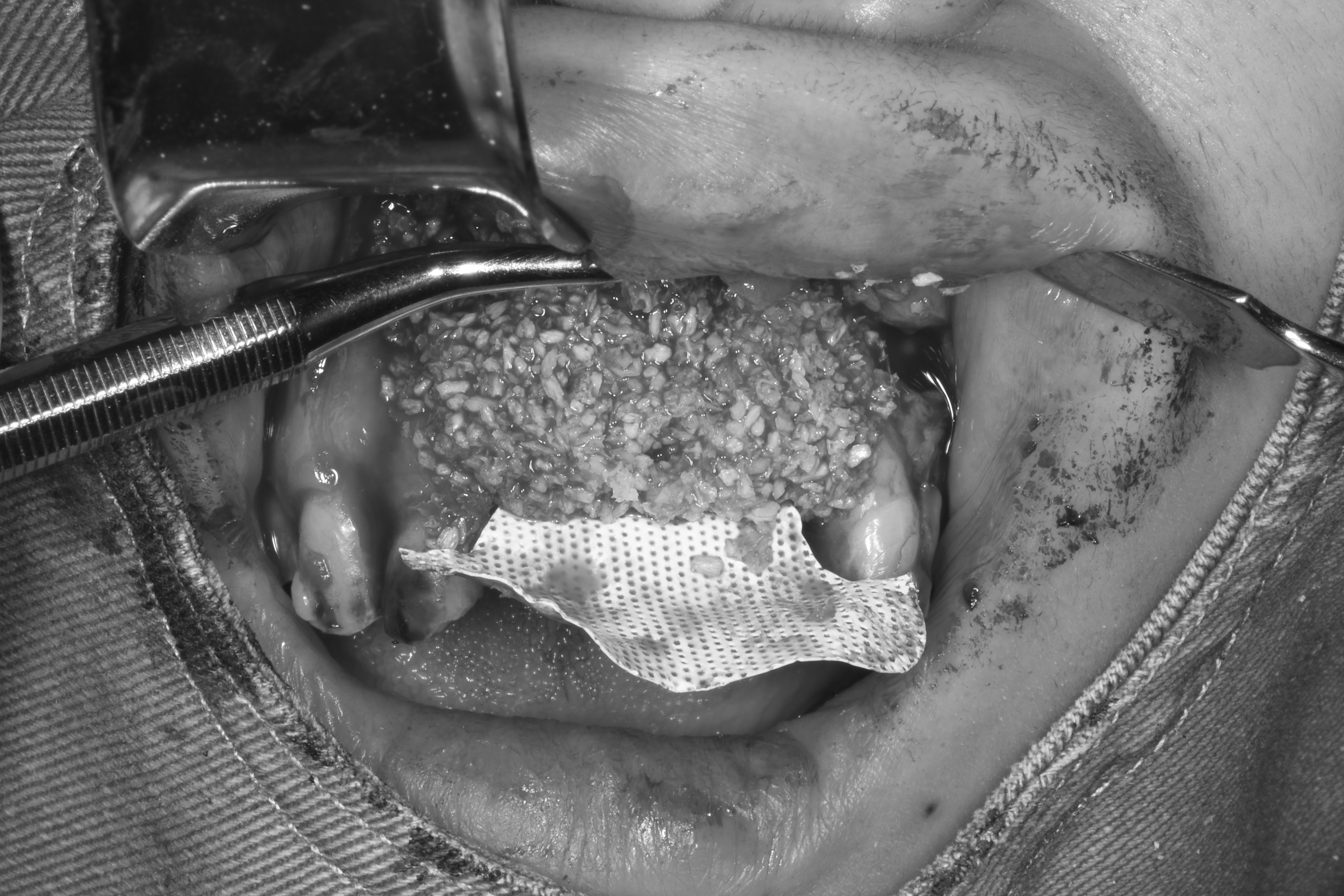 翻瓣補骨的區域,先擷取所需不可吸收骨膜的大小,用骨釘固定