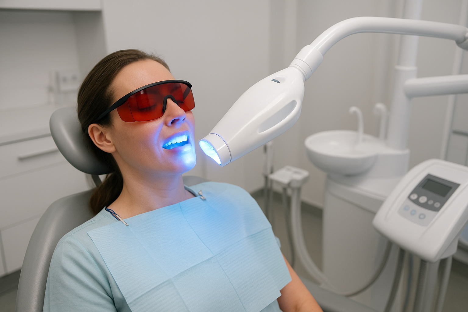 由牙醫操作的專業美白方式,透過將高濃度美白劑塗抹於牙齒表面,再以特定波長的冷光照射,加速藥劑滲透與作用,迅速分解牙齒色素。療程約一小時即可見效,能明顯提升牙齒亮白度。此方法效果快速,但需親自到診所由專業人員操作,以確保牙齒與牙齦的安全。